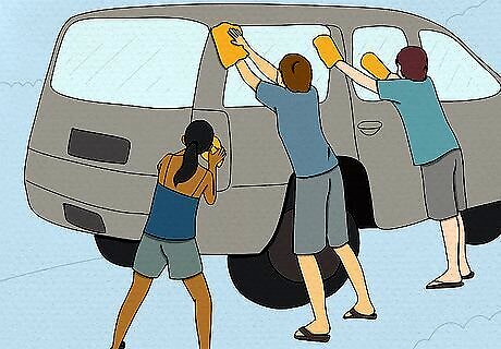 Host a group car wash. Get together with some other kids in the neighborhood looking for some easy money and offer car washes. Decide on a date and make some flyers to advertise. Pop the flyers in your neighbor's mailboxes and ask each member of the washing group to get their families to come along too. Choose a suitable car washing spot, such as at a house with a good length of driveway. Get buckets, water, wash cloths, sponges, etc. Wash cars on the day and collect the money. Only do this for local people you know, and have an adult there to supervise. Always ask before putting car washing products other than water on anyone's car.
