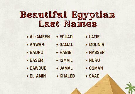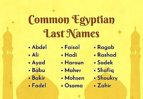 Commonly used last names are mainly rooted in Arabic. Most of these common names are derived from Arabic roots, like “Faisal,” originally meaning “to split,” and Said, meaning “master.” Some names relate to Islam, like Ashour, referring to the 10th day of the month of Muharram, or Ali, meaning “all high” in Islam. Abdel – A name used for a “servant of the” or “slave of the” master. Abubakar – Means “father of a young camel.” Ali - Means “the elevated”; also refers to the “all high” in Islam. Anani – Means “cloud” in Arabic, poetic and rare. Ashour – Refers to the 10th day of the Islamic month of Muharram. Ayad – Related to the Arabic first name “Iyad,” meaning “recurrence”; it also means “benefit, blessings, and power.” Babu – Related to the Egyptian god Babi, Osiris’s firstborn son. Bakir – Comes from the Arabic “bākir,” meaning “coming early”; it also means “copper” in Turkey. Fadel – Means “virtuous”; it comes from the Arabic “fạ̄dil,” meaning “generous” and “excellent.” Faisal – Given to a “person who separates between the true and false”; taken from the Arabic root “f-ṣ-l,” meaning “to split.” Hadi – Given to a “leader” or “guide”; one of the 99 names of God in Islam. Haroun – Egyptian form of “Aaron,” meaning “mountain of strength.” Maher – Means “talented” or “expert” in Arabic. Mohsen – Means “benefactor”; related to the first name Muḥsin, meaning “beneficent.” Osama – Means “lion”; taken from the Arabic root “a-s-m,” meaning “the one with a name.” Ragab – Means “lord of God” and “Lord Ram.” Rashad – Means “young gazelle”; also means “good judgment.” Sadek – Means “truthful”; a name given to an “honest friend.” Said – Means “master”; taken from the Arabic “sa’ada,” meaning “to be happy, fortunate, or lucky.” Shafiq – Means “compassionate,” “merciful,” and “tender.” Shoukry – Means “thankful” or “grateful.” Zahir – Means “manifest”; Aẓ-Ẓāhir is one of the names of God in Islam.