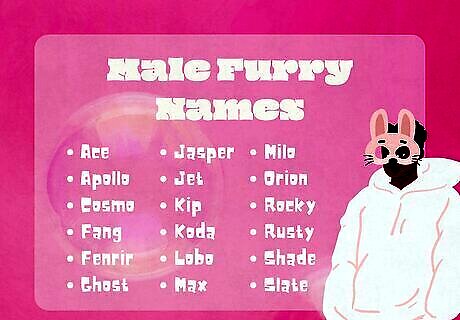 If your fursona is a boy or presents masculinely, consider a name that’s tough and rugged. Choose a real boy’s name, or opt for something more unique. Here are some examples: Ace Apollo Cosmo Fang Felix Fenrir Ghost Jasper Jet Kip Koda Lobo Max Milo Orion Rocky Rune Rusty Shade Shadow Slate Talon Thorne Tundra Zephyr