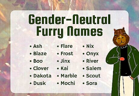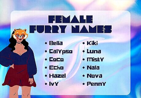 Choose a name that’s unique to your fursona. Every fursona is different, so take some time to really develop the character and figure out who they are. This way, you’re more likely to choose a name that really fits. Here are some things to keep in mind when choosing your fursona name: Gender: Is your fursona male, female, or non-binary? How do they present themselves? Keep this in mind when deciding if you want a masculine, feminine, or unisex name. Species: Wolves and foxes are common fursonas, but you can choose whatever animal you like! Consider looking up names for that specific animal to find one you like. Personality: Is your fursona fun and outgoing? Or are they more brooding and mysterious? Choose a name that fits their personality to really create a well-rounded character.