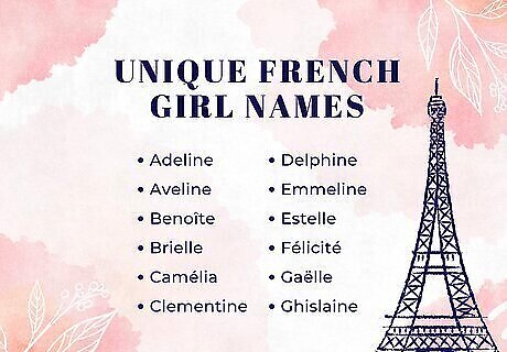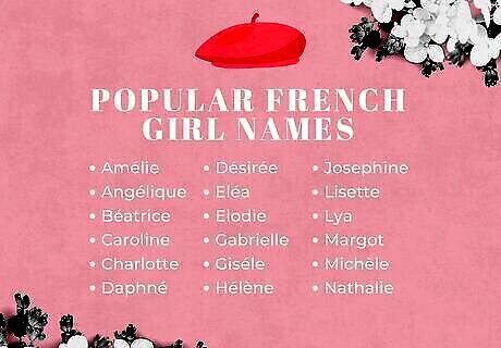 Choose something a little more rare to stand out. Many French names are popular these days, but several still haven’t caught on in non-French-speaking countries. If you’re looking for something a bit more unique, try one of these options: Adeline (meaning: noble, nobility) Aurélie (meaning: golden, gilded) Aveline (meaning: desired, island, water) Benoîte (meaning: blessed) Brielle (meaning: God is my strength, hunting grounds) Camélia (meaning: flowering shrub) Capucine (meaning: nasturtium flower) Clementine (meaning: mild, merciful) Coralie (meaning: coral) Delphine (meaning: of Delphi, womb) Emmeline (meaning: work) Esme (meaning: beloved) Estelle (meaning: star) Félicité (meaning: fortune) Gaëlle (meaning: a Gael, generous, fair) Ghislaine (meaning: pledge) Haydée (meaning: modest, reverent) Inès (meaning: pure, holy) Jacqueline (meaning: supplanter) Joëlle (meaning: Yahweh is God) Juliet (meaning: youthful) Léontine (meaning: lion) Liana (meaning: to climb like a vine) Lorraine (meaning: from the province of Lorraine) Manon (meaning: little Marie, wished-for child) Marceline (meaning: little warrior) Mavis (meaning: songbird) Océane (meaning: ocean) Odette (meaning: wealthy) Olympe (meaning: from Mount Olympus) Ottilie (meaning: prosperous in battle) Régine (meaning: queen) Reine (meaning: queen) Romilly (meaning: citizen of Rome) Rosalie (meaning: rose) Séphora (meaning: bird) Séraphine (meaning: fiery one) Simone (meaning: listening, hearkening) Soleil (meaning: sun) Soléne (meaning: solemn, religious)