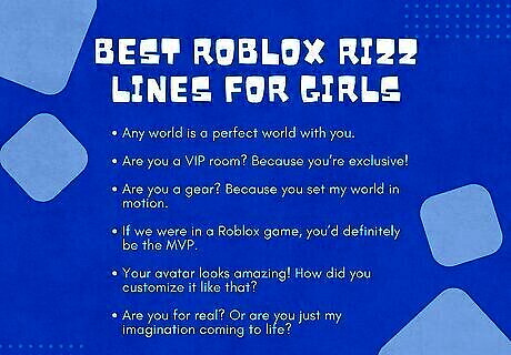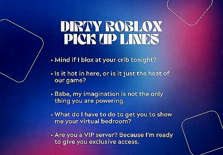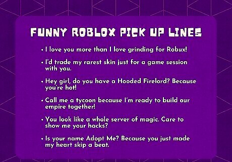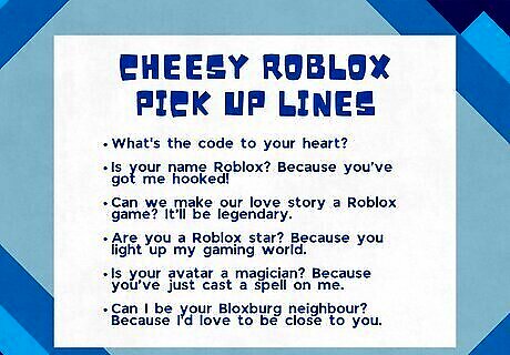 Drop a cheesy pick up line to grab your crush’s attention. Using a pick up line is a great way to convey your feelings and make the first move, especially if your line is a little corny. The following options are just the right amount of cheesy and charming, perfect for showing off your sense of humor: What's the code to your heart? Your avatar could win a beauty contest anywhere! Is your name Roblox? Because you’ve got me hooked! Are you a catalogue item? Because you're the rarest find. Can we make our love story a Roblox game? It’ll be legendary. Are you my Roblox soulmate? Because we're a perfect match. Are you a Roblox star? Because you light up my gaming world. Is your avatar a fashion icon? Because you’re rocking that style. Is your avatar a magician? Because you’ve just cast a spell on me. Do you have a map? I keep getting lost in your eyes and this game. Can I be your Bloxburg neighbour? Because I'd love to be close to you. Are you a Roblox script? Because you’ve written a love story in my heart. Do you have a jetpack? Because you’ve just taken my heart to new heights. You must be a Roblox admin because you’re always there when I need help. Are you a Roblox piggy? Because I'd go through any obstacle to be with you. Can I trade my Roblox username for your love? It's the best user experience. Are you a Roblox event? Because meeting you is a rare and special occasion. Are you a Roblox legend? Because you’re the hero that every player dreams of. Are you a treasure chest in this game? Because I just found something precious. Do you believe in love at first respawn? Because I think I just respawned right into your heart. Do you have a builder’s club membership? Because you’ve built a special place in my heart. Is your character an explorer? Because you’ve just uncovered the treasure of my affection.