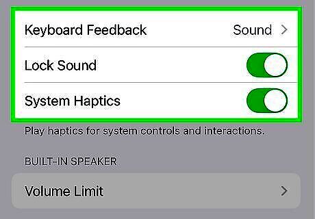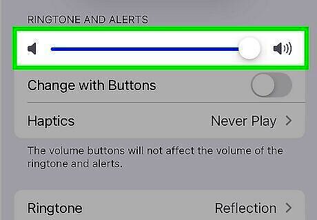 Adjust the volume and other preferences (optional). The app notification tone you selected will ring as loud as your phone ringer and text message alerts (if you've turned these features on). To check your general sound preferences, tap the back button to return to the Settings menu and select Sounds & Haptics (or Sounds on some models). Drag the slider under "Ringers and Alerts" to adjust the volume. You can also turn on audible keyboard clicks, the phone lock sound, and haptic feedback (that vibration you feel when you tap some app options) at the bottom of this section. This feature is not available on all iPhones.