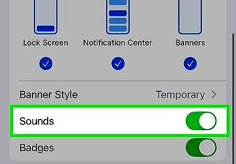 Turn sound on or off (non-Apple apps). If sound notifications are available for the selected app, you'll see a slider called "Sounds." When the slider is green, the app will announce notifications with its own built-in sound or using your iPhone's default notification sound. If the slider is white, sounds are disabled. Tap the slider to toggle it to the preferred position.
