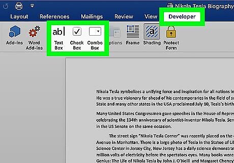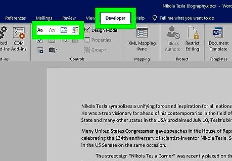 Create your form. Click the icons in the Developer tab to add elements, like checkboxes and fillable fields. You'll see the icons in the "Controls" grouping next to "Design Mode." The first “Aa” icon on the right side of the panel says “Rich Text Content Control” when you hover over it. This inserts an empty field into the document that can be filled with images, videos, text, and more. The second “Aa” icon says “Plain Text Content Control”. This will insert a blank fillable field into your document that the user can fill with text. The “Combo Box Content Control” icon is next to the check box icon, and this will insert a drop-down menu into your document. The "Properties" button will open options for you to add more items to the drop-down menu. The “Date-Picker” icon looks like a calendar and will insert an empty box that will launch a calendar so your form user can pick a specific date. The "Properties" button will open options for you to choose the box format and display. The check box icon adds a check box to your document. After this, you've created your fillable form! However, you can't use it completely until you've restricted editing of the document. By continuing on to the next steps, you can use keyboard shortcuts like Tab to go to the next question.