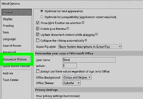 Click Options and Customize Ribbon in the File menu. You’ll find the File at the top of your program window, and a panel on the left side of the window will open. Options will be in the last option in the menu. The Customize Ribbon button is in the middle of the menu in the window that pops up.