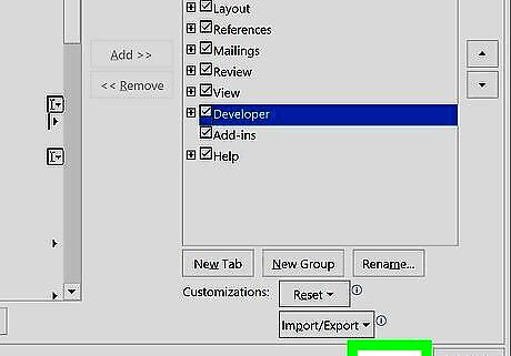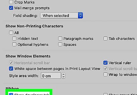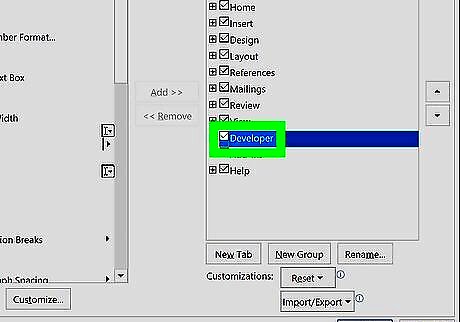 Check the “Developer” box in the Customize Ribbon panel. You'll see this under the "Customize the Ribbon" header over the right panel. If you don't see this checkbox, make sure the drop-box says "Main Tabs."