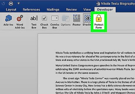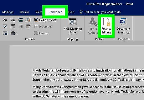 Click Restrict Editing in the Developer tab. This will pull out a panel from the right of your program window. Find it in the "Protect" group.