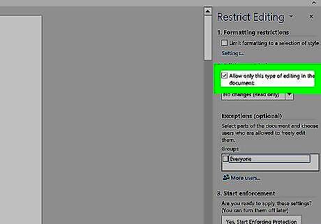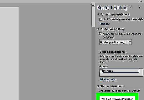 Click Yes, Start Enforcing Protection. A box will pop up asking for a password. You can enter a password if you want to allow other people with that password to edit your document. If you share the document without the password, others will only be able to use the fillable forms.