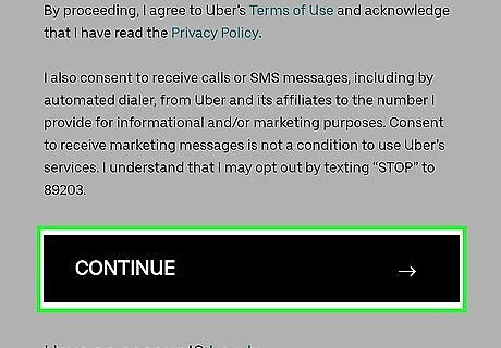 Fill out the form and tap Continue. You will need to provide an email address, your full name, phone number, city, and create a password. If you have an invite code, type it in the box that says "Invite code". Using an invite or referral code can earn you extra money. If you already have an Uber account, tap "Log in" and sign in with your email and password.