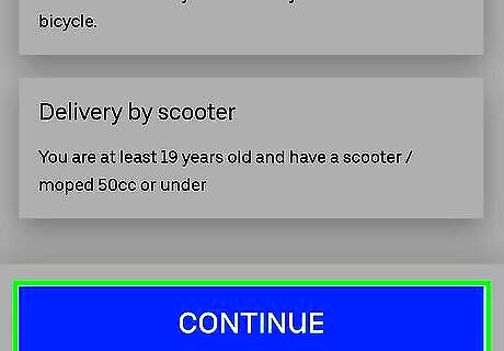 Tap Continue. This screen tells you the vehicle requirements to drive for Uber. You must be at least 21 years old, have a 2003 or newer vehicle that is not salvaged, and has at least 4 doors.