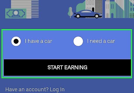 Select your car option and tap Start Earning. If you have an eligible vehicle, you can select "I have a car". If you need a car, tap "I need a car" to see if there are leasing options available in your area.
