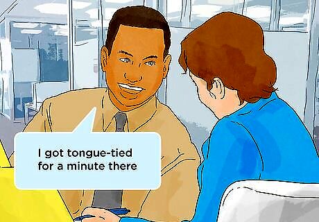 Keep your cool. The goal of answering this question isn't just to get information about who you are. It's about how confident you are, how well you speak, whether you’re calm and deliberate, and whether you can establish a rapport with the interviewer. If you do happen to mumble an answer or say something you didn’t mean to, laugh it off. Chuckle and say something like "Boy did I get tongue-tied for a minute there." Then move on, showing that you are confident in yourself and that one little slip up isn’t the end of the world to you.