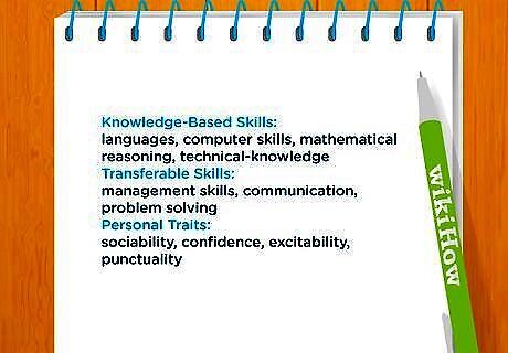 Brainstorm your skills and abilities. Write down a list of good qualities about yourself that show you’re just right for the job. Anything that comes to mind should be jotted down until you run out of ideas. Skills and abilities generally fall into three main qualities: Knowledge-Based Skills. These are skills that you learn as you mature and include languages, computer skills, mathematical reasoning, and technical know-how. Transferable Skills. These are skills that you take from job to job. They include people management skills, communication, and problem solving. Personal Traits. Your unique, innate qualities including your sociability, confidence, excitability, and punctuality.
