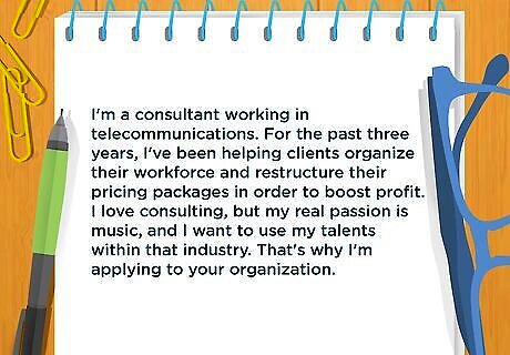 Gauge the feel of the interview. The interviewer will most likely ask the question early on in the interview, so you might not have much to work with. Some interview settings will call for a polished sales pitch while others will require a more casual touch. Here’s an example of a polished sales pitch: "I'm a consultant working in telecommunications. For the past three years, I've been helping clients organize their workforce and restructure their pricing packages in order to boost profit. I love consulting, but my real passion is music, and I want to use my talents within that industry. That's why I'm applying to your organization."