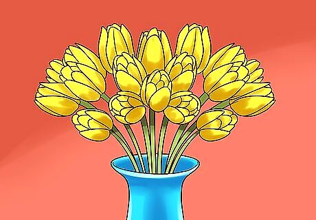 Choose an ideal color. Tulips come in a fairly wide range of colors, and your arrangement can include one or more of these colors. For home decor purposes, most people prefer to choose colors that coordinate well with the colors of the room. You can use tulips to draw out an accent color already in the room or to add contrast to the colors of that room. For instance, red tulips might look nice in a bedroom with red throw pillows and neutral walls. On the other hand, bright orange tulips can add a pleasant splash of complementary contrast to a room decorated in nothing but shades of blue. Another option is to choose the color based on meaning. In the language of flowers, each tulip color carries a slightly different meaning. Red tulips are a declaration of love and mean "please believe me." Yellow tulips once signified hopeless love but now state, "there's sunshine in your smile." White tulips can symbolize forgiveness, heaven, novelty, and purity. Cream tulips say, "I will love you forever." Purple tulips symbolize wealth and royalty. Pink tulips symbolize deep affection. Orange tulips stand for energy, desire, and passion. Variegated tulips state, "you have beautiful eyes."