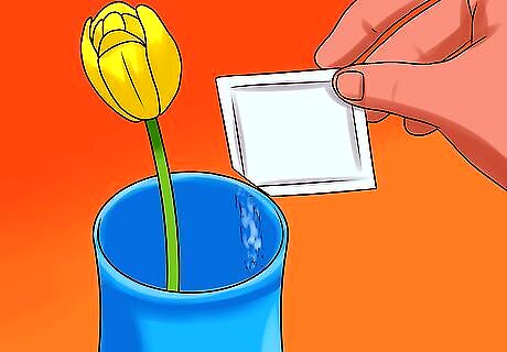 Consider adding plant food. There is some debate regarding how helpful floral preservatives are when arranging cut tulips. While some argue that tulips do not need powdered plant food, there is no evidence to suggest that this preservative will hurt the flowers, so you can add it as a precaution if desired. Floral preservative can be purchased at nearly any floral shop. Some may even come with your tulips when you buy them. Sprinkle the preservative in the water and let it dissolve before arranging your tulips. Add more preservative each time you change the water.