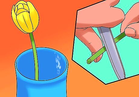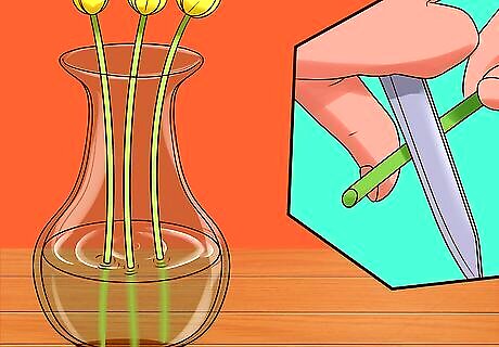 Trim the stems under running water. Use a sharp, clean knife to cut the bottom 1/2 to 1 inch (1.25 to 2.5 cm) of each stem. The cut should be made diagonally so that the stems can draw up more water. As stems dry, they gradually close up, restricting their ability to draw in water. Making a fresh cut re-opens the stem and makes it easier for the tulip to drink. You can lay the tulips flat as you do this, but cutting the stems under still or running water is recommended to prevent air from entering the fresh cut and blocking the water channels inside the stem.