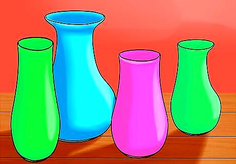 Pick a container. Single tulip displays can work well in a range of containers, too, but the containers either be very narrow or very short. A single bud vase would work well as a more traditional option, or you can look for a tall, narrow cylinder vase that extends above the height of the entire tulip. Make sure that the vase is skinny enough for the tulip to fit snugly; otherwise, the flower will flop around inside. Glass bottles with narrow mouths can be a good option if you want to go the recycled, rustic route. Teacups, baby food jars, and tiny tin cans are a few other options.