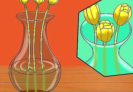 Refill the water. Tulips are heavy drinkers, so you should check the water level twice a day and add fresh water at least once a day. To improve the health of your tulips, it is wise to completely change the water every three or four days. Changing the water as soon as it starts to look cloudy minimizes the amount of bacteria in the water, thereby increasing the overall lifespan of your flowers.