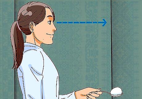 Pick the spoon up until it is level with the bottom of your chest. Most people raise the egg up high and push the spoon out in front of them without realizing that they are throwing off their balance. To avoid this, get into a strong starting position by standing up straight and holding the spoon out slightly in front of your body. Make sure the egg isn’t visible on the edge of your vision. If the egg is visible out of the corner of your eye, you probably will look at it. As soon as you look, you lose some control over it. Keep the spoon even with the center of your body so you aren’t tempted to look down.