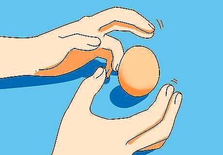 Adjust the egg’s positioning with your index fingers. Loosen your grip slightly, enough to feel the egg shifting. Unless you’re super lucky, the egg will begin to tip over, so keep your fingers around it. Use your index fingers to control the egg, moving it until it feels stable enough to stand on its own. Always move the egg in the direction you feel it falling toward. For instance, if the egg begins tilting to your right, push its base a little to the right to balance it. This part usually takes a while. The yolk isn’t perfectly centered in most eggs, so be patient while you search for that sweet spot of balance.