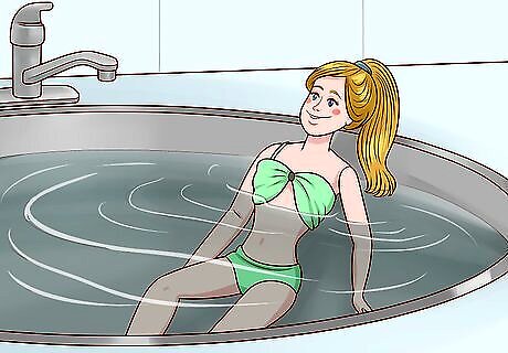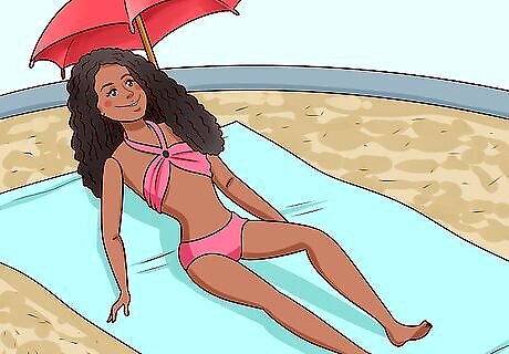 Create a pool for Barbie using a sink or plastic container. Fill a bowl or plastic container with water and dress Barbie up in her swimsuit so that she can go swimming. Make sure Barbie is able to get wet before dipping her in the water, especially if she has a special hairdo. Have Barbie throw a pool party and invite her friends. Play music, have Barbie sit on a pool towel next to the pool, or let her practice doing fun dives into the water.