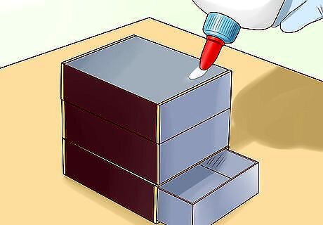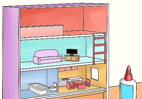Stack empty matchboxes on top of one another to form drawers. You can color, paint, or cover the outside of the matchboxes with paper beforehand, if desired. Place the matchboxes on top of one another, adding drops of glue in between each layer to keep them all in place. Place Barbie’s things, such as her hairbrush, phone, mirror, or books, in the drawers. If you only have one matchbox, prop the matchbox up on something like a piece of cardboard or paper clips and turn it into a one-drawer nightstand. Cover the new drawers with stickers, glitter, or pictures.