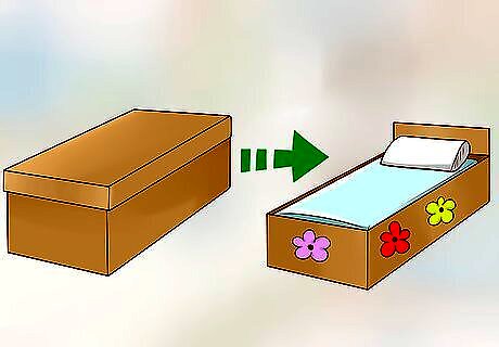 Turn a shoebox into a bed for Barbie. Find an old shoebox from your closet, garage, or other storage spot and empty it out. Place a washcloth or small blanket inside, as well as something that will be used as a pillow. Now Barbie has a bed ready for sleeping! Create a pillow by stuffing a piece of fabric or a cloth bag with tissues or stuffing. Decorate the sides of the bed using markers, pencils, or paint.