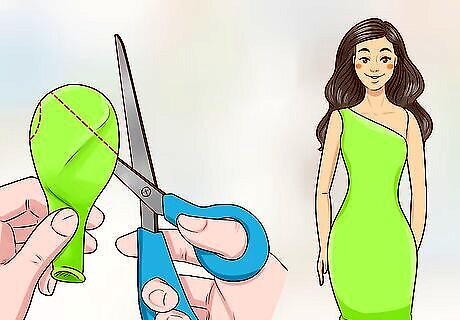 Cut up balloons to make clothing for Barbie. Cut both ends of the balloon off using scissors to create a skirt or strapless dress, or design more detailed shirts and dresses by cutting arm holes into the balloon. Slide the balloon up over Barbie’s body starting at her feet once you’re done. The balloon should be deflated to use it as clothing.