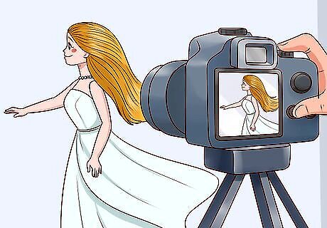 Have Barbie star in her own movie using a video camera or phone. This could be an action movie where Barbie is involved in a high-speed car chase, a romantic movie where Barbie falls in love with someone, or any other genre that you like. Use a phone or video camera to film each scene so you can watch it later on. Plan out each scene before filming, such as which props you’ll need and what Barbie will say. Ask friends or family members to help you shoot the movie so that you can have more characters in it. For example, you could film the movie outside and pretend that Barbie is stuck on an island and needs to be rescued.