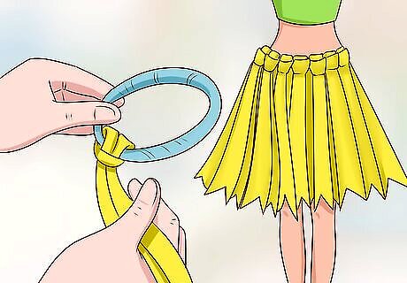 Tie ribbon onto a small hair band to make a tutu for Barbie. Find an extra hair tie and ribbon that you like. Cut the ribbon into 6 in (15 cm) sections, and then tie the ribbon onto the hair tie so that the middle of the ribbon is where the knot is. Do this all the way around the hair tie to create a fun tutu. Use different colored or patterned ribbon to make the tutu super colorful. If your hair tie is too big and won’t fit Barbie, find a rubber band and cut it before tying a new knot to make it the perfect size.