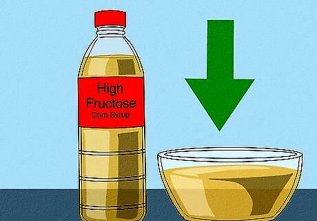Eat less high fructose corn syrup (HFCS). Fructose is a sugar that goes through your body, like the glucose sugar that your body usually uses. However, fructose has its own pathways. It can turn into glucose for your muscles and brain to use, but it tends to go straight toward making fat in your body, when there is too much sugar in your body. Fructose is found in fruits and vegetables naturally, but it is found in high concentrations artificially, as High Fructose Corn Syrup. High fructose corn syrup is used as a sweetener so much that we don't realize it can be found in almost everything. It is in lots of processed foods, pastries, and beverages, so eating less of it might be a little difficult, but it's good to be aware of what you're eating.