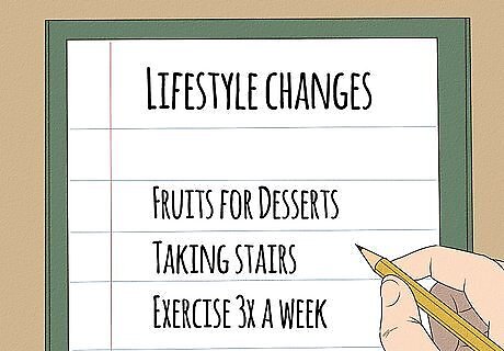 Write down realistic lifestyle changes. Remember that too many lifestyle changes at once is a recipe for failure. It is important that you only try to implement so many changes at once. Think about what lifestyle changes you need to make in order to achieve your goals. If you don't think you'll be willing to make the lifestyle changes needed to meet your goal, revisit your goals and change them as needed. Lifestyle changes are small changes in behavior that may result in improved health or well-being. Studies show that small lifestyle changes over long periods of time are more sustainable. Examples of lifestyle changes include: replacing desserts with fruit or taking the stairs instead of the elevator. The lifestyle changes you want to make may also help you make, change, or come up with additional goals. For example, you might want to eat healthier. A goal could be to eat a fruit or vegetable every day.