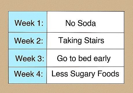 Assign a timeline for your lifestyle changes. Even with small lifestyle changes, trying to accomplish multiple items at one time can be difficult and hard to keep up with. Assigning your lifestyle changes to an ordered timeline can help you be more successful. Try to note which changes you'll make first, second, third, etc. After you've come up with your goals and the lifestyle changes to help you meet them, assign an order to your list. For example: Week 1: Give up soda; Week 2: Take the stairs instead of the elevator; Week 3: Go to bed earlier. Continuously reevaluate your progress. If you notice one lifestyle change in particular is giving you trouble, rework your timeline to account for that. Give yourself time to make these changes a habit. Again, if you try to work on multiple items at one time, you may be less successful.