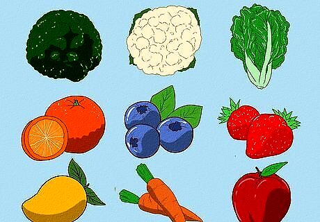 Eat a fruit and vegetable every day. Eating enough fruits and vegetables is key for a healthy lifestyle and diet, since these foods are essential sources of vitamins, minerals and antioxidants. However, eating the recommended seven to nine servings of fruits and vegetables everyday may be daunting or difficult. If you're not a big fruit or vegetable eater, make a list of your top five favorite fruits and vegetables. Start by adding in just one serving of fruit or vegetables a day. As you get comfortable with this goal, add two servings a day. If you dislike many fruits and vegetables, go to the grocery and pick out something new or unfamiliar to you. Or try an item that you haven't had in a while. Keep fresh fruit on the counter and vegetables cut, washed, and ready to eat in the fridge. The less preparation needed, the more likely you'll include them in your diet. If you enjoy a sweet after dinner, try having fruit with your dessert. Keep in mind that fruit skins have the most nutrients. Say, in an apple, keep the skin on. Don't eat pomegranate skins, even though that is where the nutrients are.