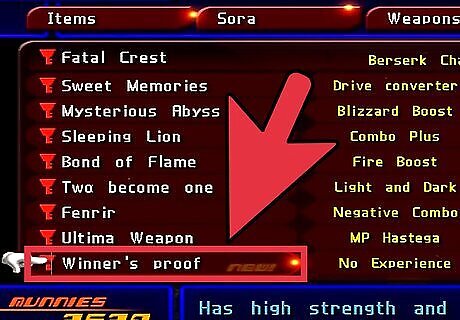 Obtain Winner's Proof. This keyblade gives Sora a +7 boost to magic, perfect for magic-type abilities. Complete all the Mushroom XIII mini-games to get this keyblade.