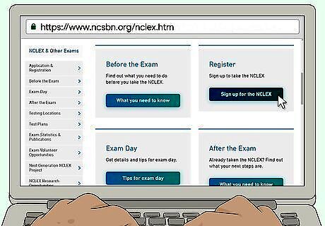Take the licensing exam to become a registered nurse. After finishing your bachelor’s degree, sign up for the National Council Licensure Examination (NCLEX-RN) and select an exam date. Show up to the testing location on time and complete the licensure exam to the best of your ability. If you pass, you will receive your nursing license. If not, you can retake the exam after 45 days. You will have 6 hours to complete the NCLEX-RN, and it has a minimum of 75 questions and a maximum of 265. Look for practice exams online so you can study and see what you need to improve on.