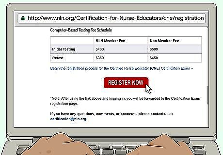 Take the Certification for Nurse Educators exam to look more qualified. While you don’t need the Certification for Nurse Educators to find a position, it will make you more competitive when you apply. Fill out the exam application on the National League of Nursing website and wait to receive an email back confirming your eligibility. Then schedule the exam within 90 days of your confirmation and pay the $500 USD fee. If you pass the exam, you’ll receive your certification in the mail within 6–8 weeks. You can register for the certification exam here: http://www.nln.org/Certification-for-Nurse-Educators/cne/registration. The subjects and number of questions on the test vary, but you can find the current ones listed on the exam website along with study guides.
