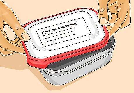 Include a list of ingredients and instructions. Even if you've checked with food sensitivities beforehand, it doesn't hurt to send a list of ingredients for anyone else who is enjoying the meal. Say how to reheat it (“Place it in the oven for 10 minutes at 200 degrees” or “Reheat in the microwave for 3 minutes”) and how to store it (in the fridge or freezer). For example, attach a piece of paper with the ingredients and any other special instructions with the meal or tape it to the sides of the container.