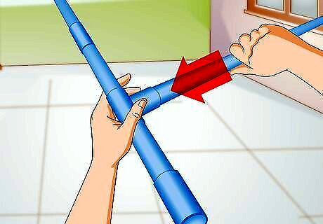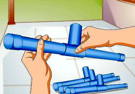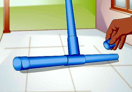 Build the feet of the jumps. Slide two 12-inch (30.48 cm) pieces into the top and bottom ends of a tee joint. Then put caps on the ends of the 12-inch (30.48 cm) pipe. Repeat this process three more times to make all four feet for your jumps. If the pieces do not slide together easily, you might consider using a hammer and block to tap them together.