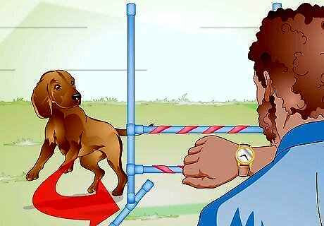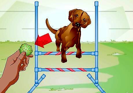 Entice your dog with a reward. One of the easiest ways to get your dog to go over the agility jump is to stand on the other side with a treat. When your dog jumps over the bars, give it the treat and some praise. However, if the dog goes around the bars, do not give it the treat. Eventually, your dog will learn to associate jumping over the bars with a treat. Over time, they will jump without being prompted.