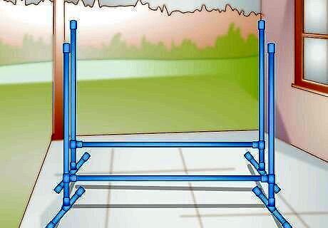 Assemble the jump. Insert a 30-inch (76.2 cm) into the open tee joints at the tops of each base and put caps on the open pipe ends. Then clip two jump cups onto the 30-inch (76.2 cm). With the cups facing each other, place one 50-inch (127 cm) piece of ¾-inch (1.9 cm) in-between each jump cup. This should give you two parallel jumping bars for each of your jumps. You should be able to find the jump cup clips online. You can also make your own. If the bars do not fit perfectly, consider sawing off a little at the ends until they fit. The bars should rest securely but fall easily if bumped.