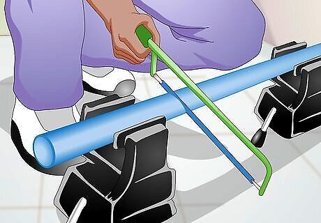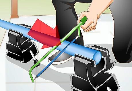 Cut the PVC. Once you have measured and marked your pipe, cut the individual pieces using a pull saw (hacksaw or miter saw) or a circular saw. Using the saw, you will want to cut along the lines that you marked on the pipe until you have 16 individual pieces of PVC pipe. When cutting the pipe, you should place the PVC pipe in a vise or hold it in place with a clamp. When operating a circular saw, you should always wear eye protection and keep your fingers away from the blade. A miter saw and box may will give you more control over your cut, making it more accurate. You also do not need a clamp or vise since the miter box will hold the pipe in place. If you use a hacksaw, always secure your pipe within a vise or with a clamp. This will help prevent you from cutting yourself.
