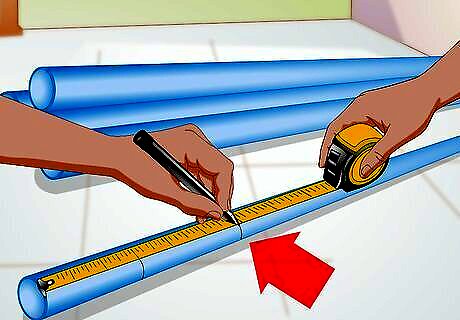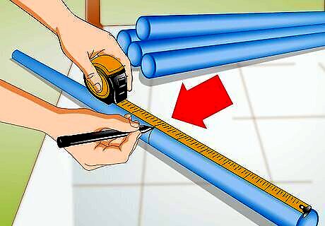 Mark your measurements. Depending on where you bought the PVC pipe, you will need to measure and mark the pipe before you cut it. Most 1½-inch PVC pipe comes in in 5-foot (1.52 m) lengths. With a tape measure and Sharpie, measure and then mark the cuts that you need to make on your PVC pipe. For your convenience, you might also ask the sales associate if they would cut the pipe to your specifications. Whether you cut it yourself or have someone else do it, you will need to make the following pieces: 8 12-inch (30.48 cm) pieces. 2 48-inch (121.92 cm) pieces. 2 5½-inch (13.97 cm) pieces. 2 6 ½-inch (16.51 cm) pieces. 2 15¼-inch (38.74 cm) pieces.