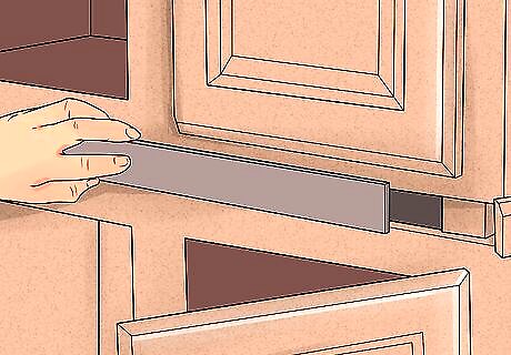 Use matching plywood skins to conceal the joints in stacked cabinets. If you opted to incorporate both cabinets and vertical shelves, you may want to cover their outer faces to give them a more seamless appearance. To do this, use a utility knife and straight edge to trim plywood skins so that they'll fit over the entire surface. Glue the skins directly to the cabinet using contact cement. Plywood skins are available at any hardware store or home improvement center. You can also get them from the same company who manufactured your cabinet or shelving units to make sure they're a match. Contact cement dries and holds fast, so you'll need to work quickly and make sure your skin is lined up properly the first time.