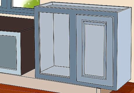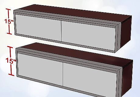 Purchase two 15 in (38 cm) floating cabinet units to use as the seat base. Over-the-refrigerator cabinets will work best, as they're shorter and easier to maneuver than full-sized cabinets. For an average-sized window nook around 6 feet (1.8 m) in length, you'll need a pair of cabinets. Consider buying more units if you think you might want to add more storage. Measure your window to the nearest ⁄2 in (1.3 cm) and, if possible, shop around for cabinets that will fit this space exactly. Alternatively, you could find an open-faced bookshelf or vertical cabinet and turn it on its side to function as both base and bench.