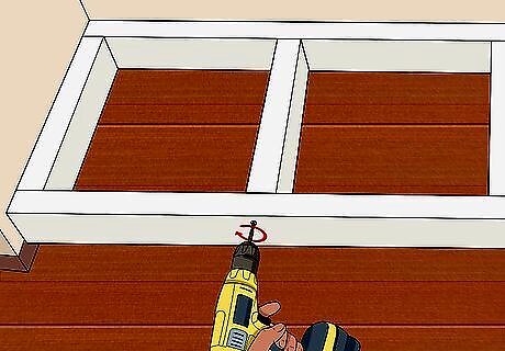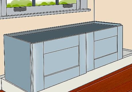 Arrange 2x4 or 2x6 boards into a frame around the front of the window. Fit the boards together into a rectangular shape the length and depth of the window space you've chosen. This type of frame is known as a “toekick.” When it comes time to assemble your window seat, you'll simply side your cabinets right inside your frame. Use a circular saw to trim your boards to the necessary size. If you want, you can extend your frame enough on either side to make room for additional cabinets or bookshelves for extra storage space. Be sure to measure your cabinets or shelves in advance to guarantee a proper fit.