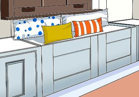 Bring in cushions and pillows to provide the finishing touches. Lay down 1 or 2 long cushions to cover the bench from end to end. Place a few decorative throw pillows on top, along with any other accessories you wish to include. All that's left to do now is sit down, kick your feet up, and enjoy the fruits of your labor! A cozy blanket or quilt can also be a good to have around for both comfort and presentation. If you don't want your bench cushion to slide around, cover it with length of durable fabric and staple the edges to the lip inside the top of the cabinets.