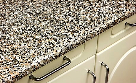 Choose a material for your countertops. This is perhaps the biggest decision when buying a countertop. Price, durability, and appearance will vary between materials. Laminate countertops consist of a decorative veneer affixed to an engineered wood core. These tops are typically the most inexpensive and lightweight of all materials. They are also easier to install than other materials, because they are easy to maneuver and cut, and won't warp or splinter like some natural materials. Laminate countertops are available in an array of colors and faux finishes. Solid surface countertops are made from a blend of polyester and acrylic. Unlike laminate tops, they can be sanded if stained or damaged. They also fit together more seamlessly than laminate countertops. Granite countertops are some of the most durable on the market. They can withstand high heat and scratches, and have the natural beauty of stone. Because granite is porous, these tops have to be sealed periodically. Wood countertops can be stained, oiled, or waxed for a distinct natural finish. Like granite, they must be sealed periodically. Wood countertops can be more easily cut and sanded than stone tops, which makes installation and upkeep easier.